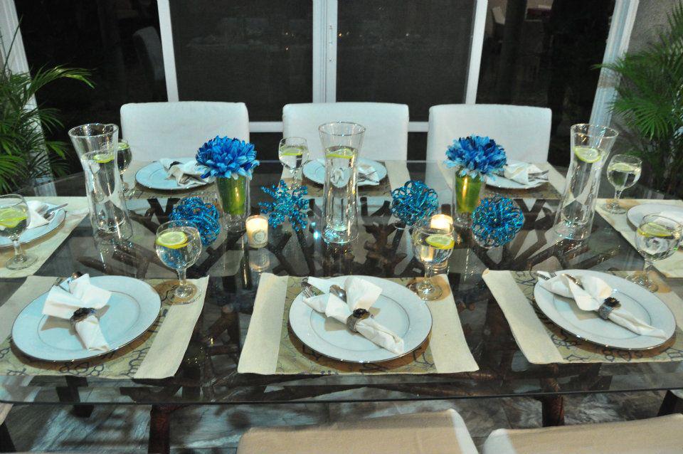 | Each water goblet has a slice of lemon to give a nice color contrast against the blue centerpiece. |